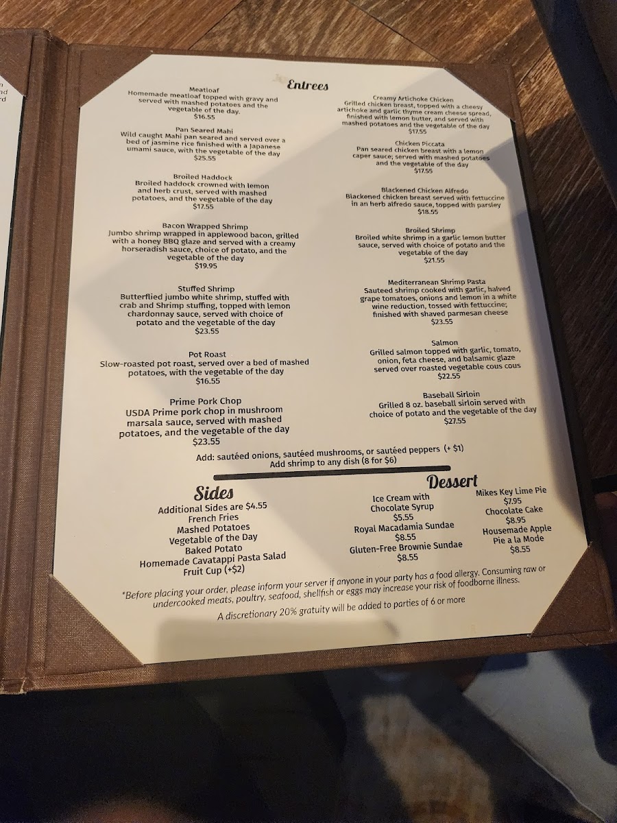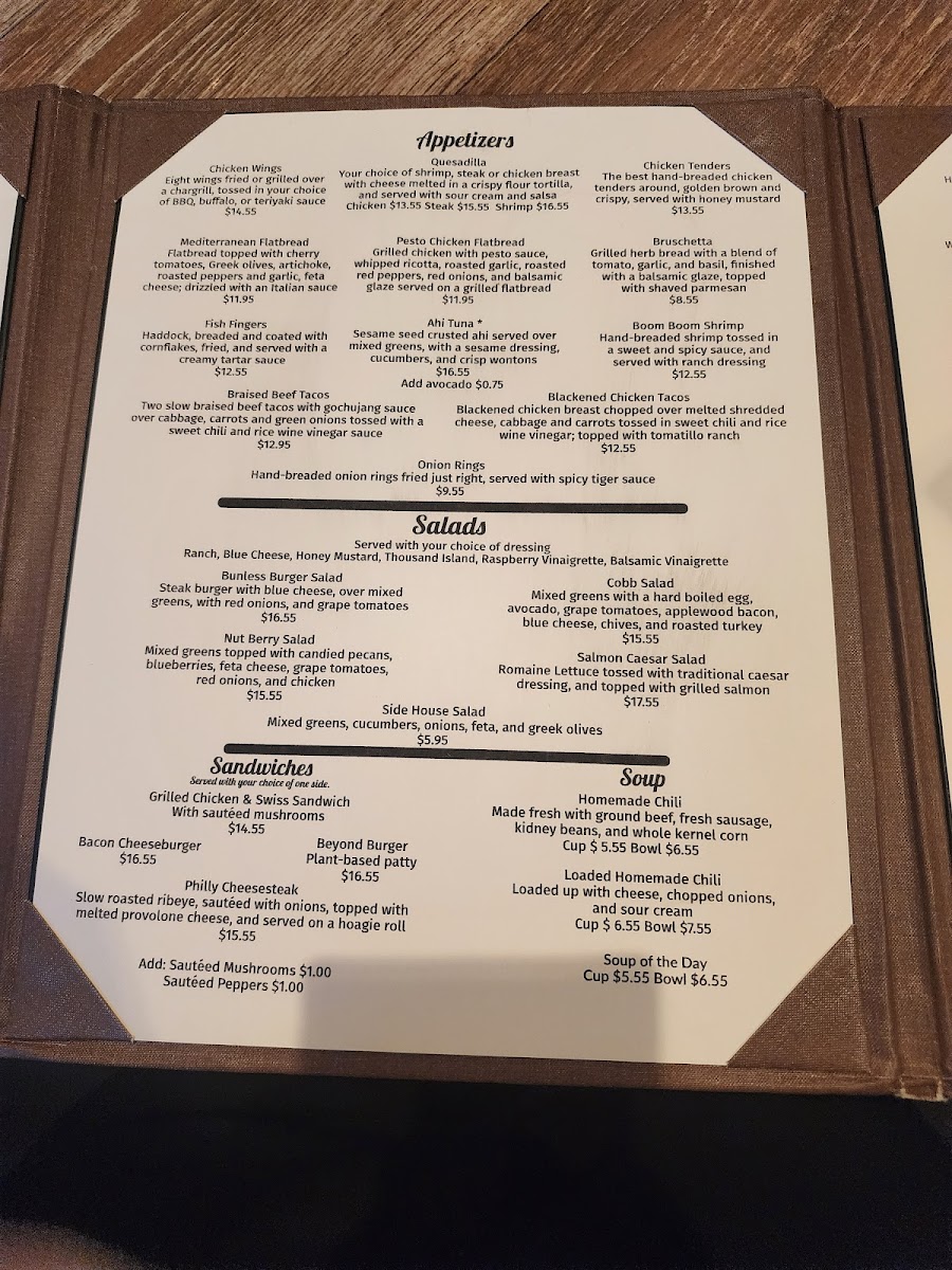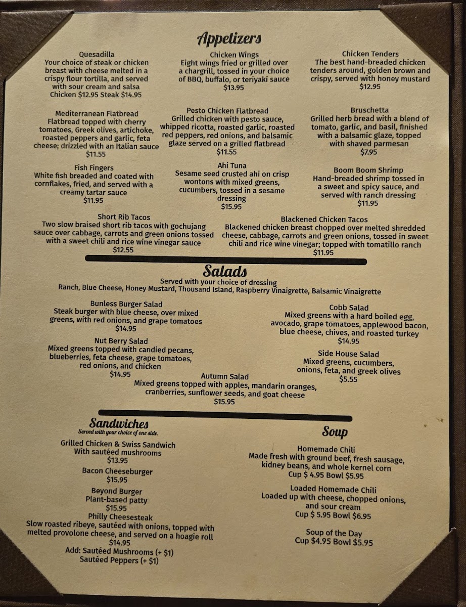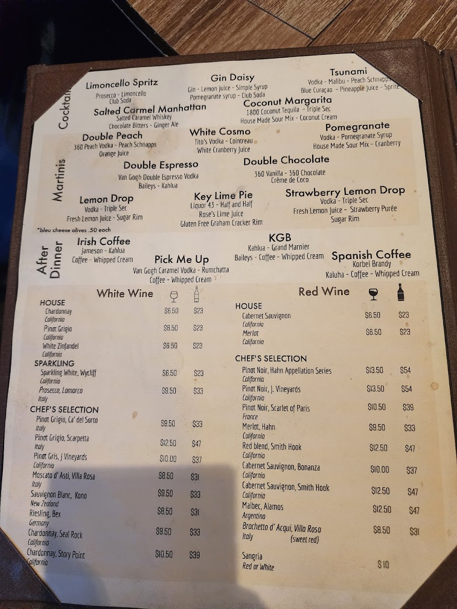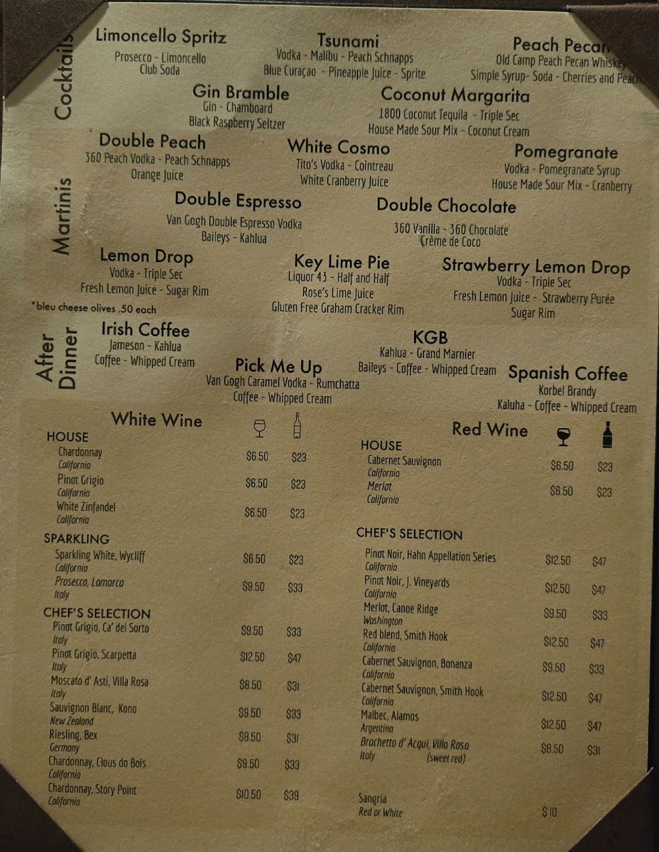 Evenings here often include sharing starters like the Steakhouse Quesadilla or hand-breaded Onion Rings, served in a comfortable, rustic environment where good company and relaxed conversation come naturally. Desserts like Apple Pie or Key Lime Pie provide a classic finish, while thoughtfully crafted drinks such as martinis add a touch of ease to the dining experience.
