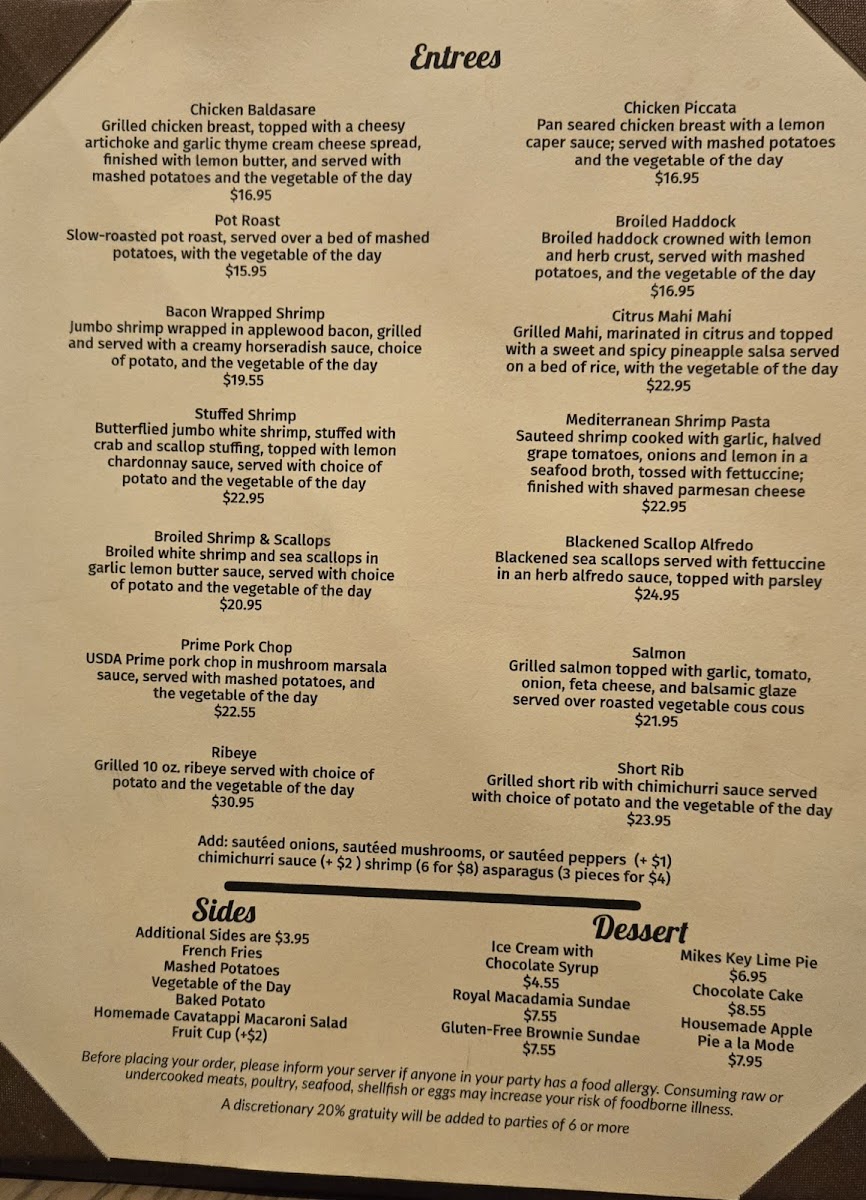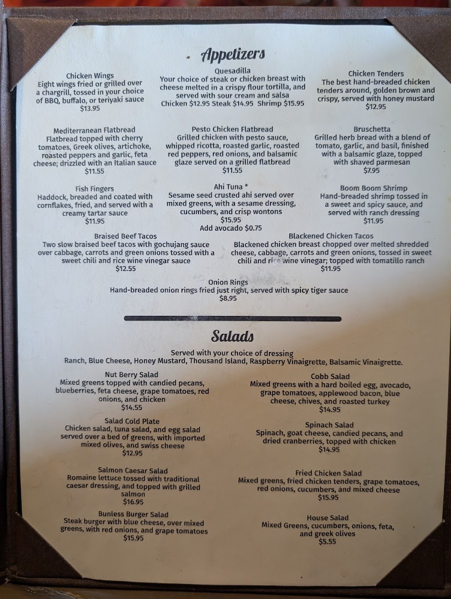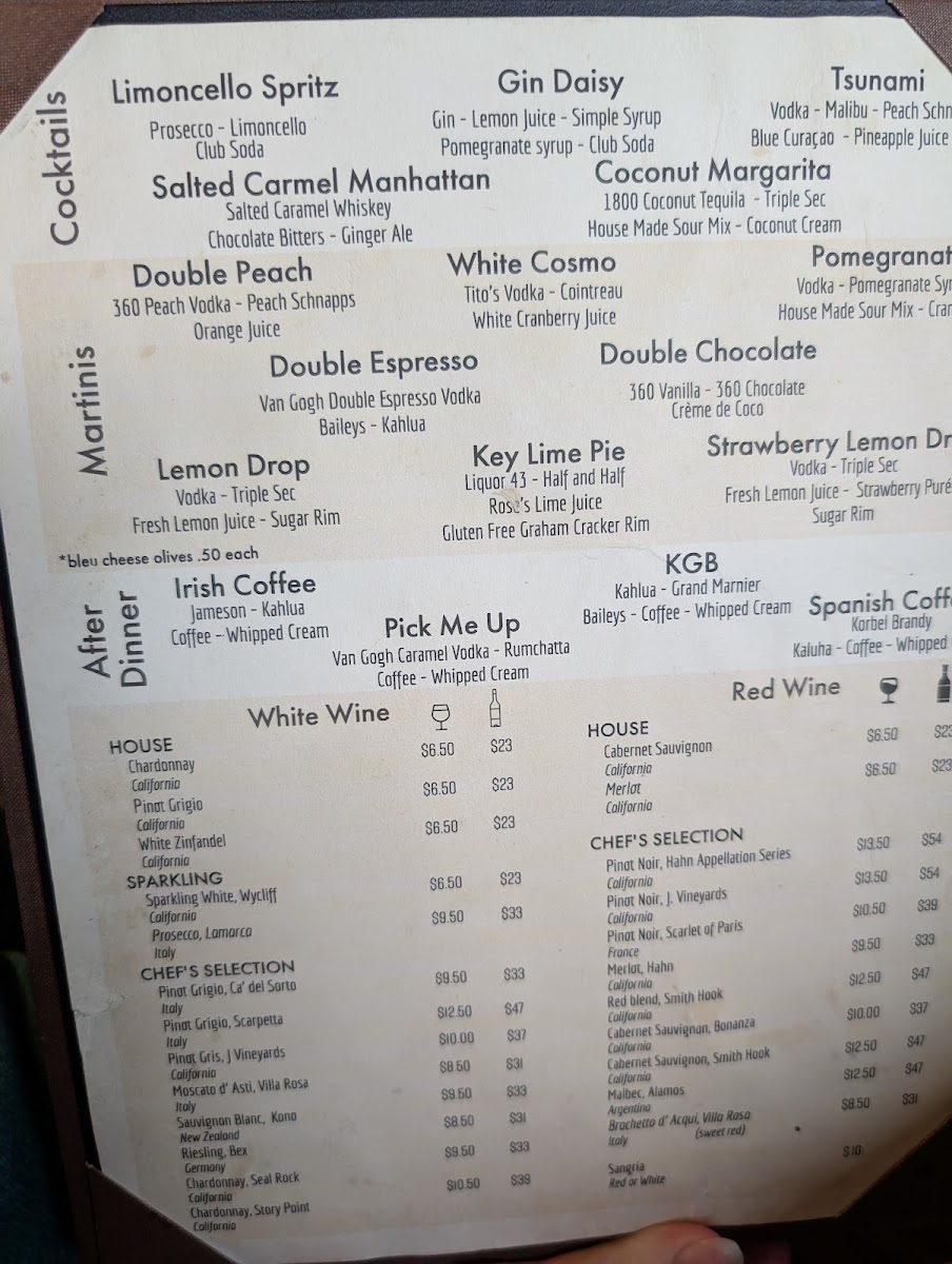 The menu leans toward approachable favorites, with hearty options like the Fish Sandwich, French Dip, and Burger and Fries alongside lighter choices such as Cobb Salad and Bunless Burger Salad. For those who enjoy seafood, fresh preparations like Ahi Tuna, Shrimp and Scallops, and Lobster Tail are available, offering a taste of the coast that pairs well with the friendly bar setting.